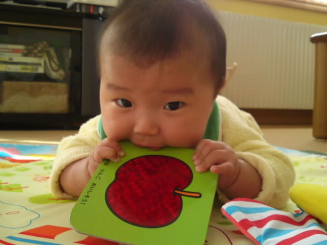 手に触れたものを掴めるようになったかと思ったら、上手に口へ運べるようになったちびもっちだよ。