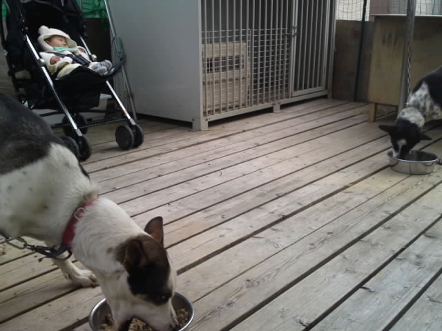 でもちびもっちはご機嫌にしていたので、そのまま犬たちの所にお邪魔してご飯食べてるところを見学してもらいました。