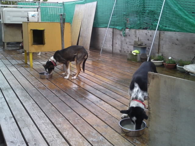 犬たちも雨の中での食事です。