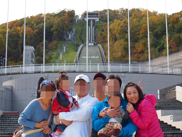 スキージャンプの記念撮影。3人でやっているのはクロスカントリー体験。なまら疲れた!