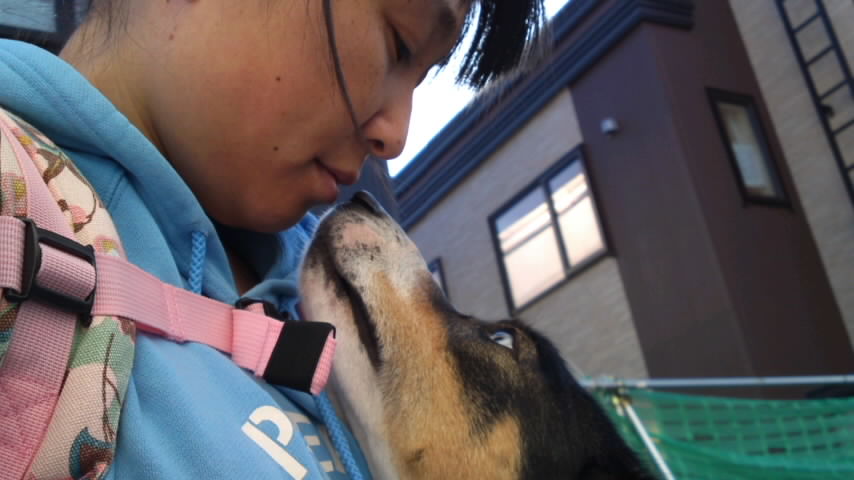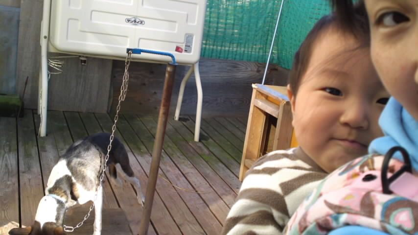 一緒に犬たちの世話してます。えらいぞ!(わたし)