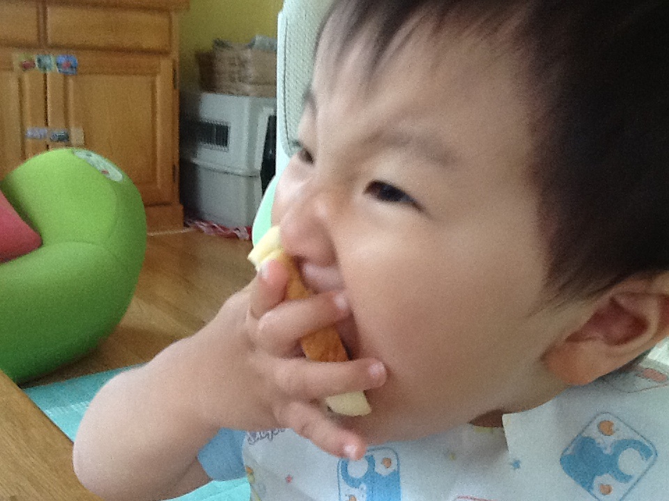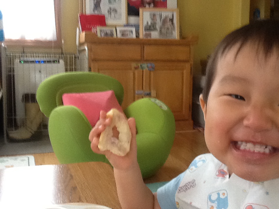 パンに塗ってあげたら、ものすごく気に入って、クリームチーズが付いているところから食べてたら穴があいちゃったようです。