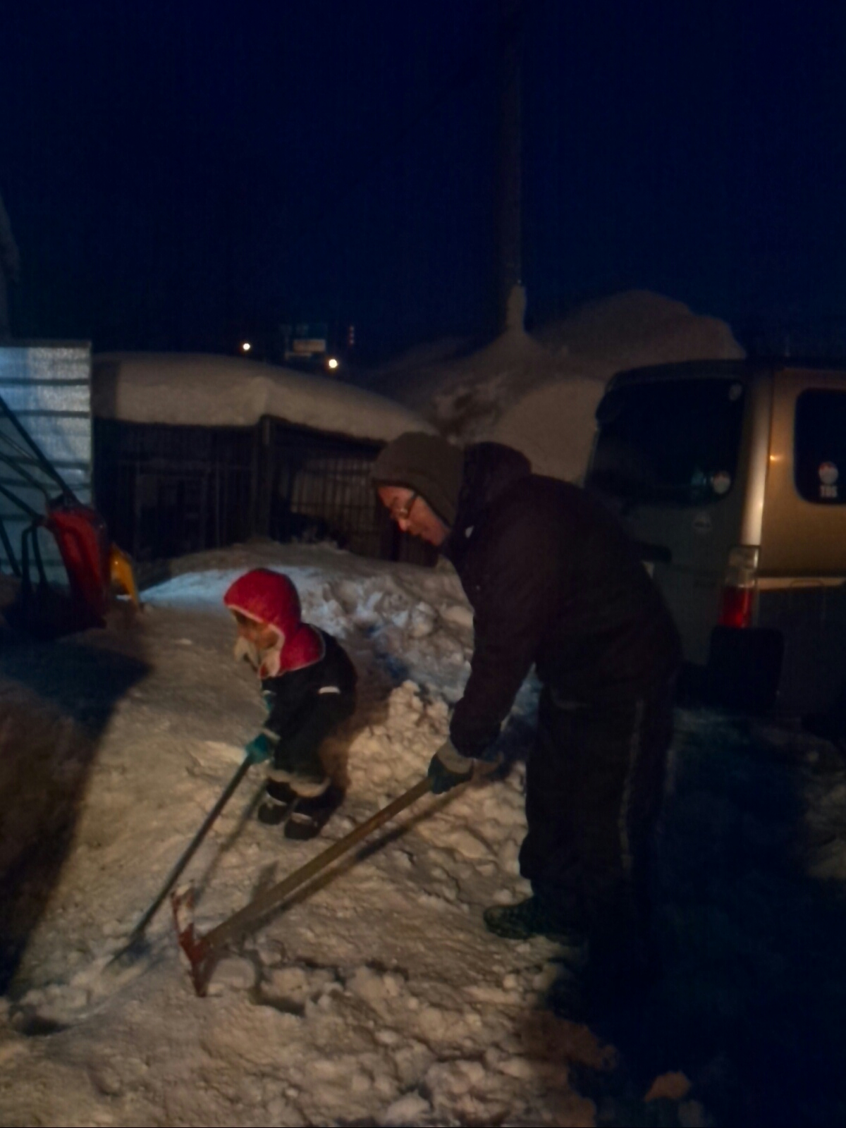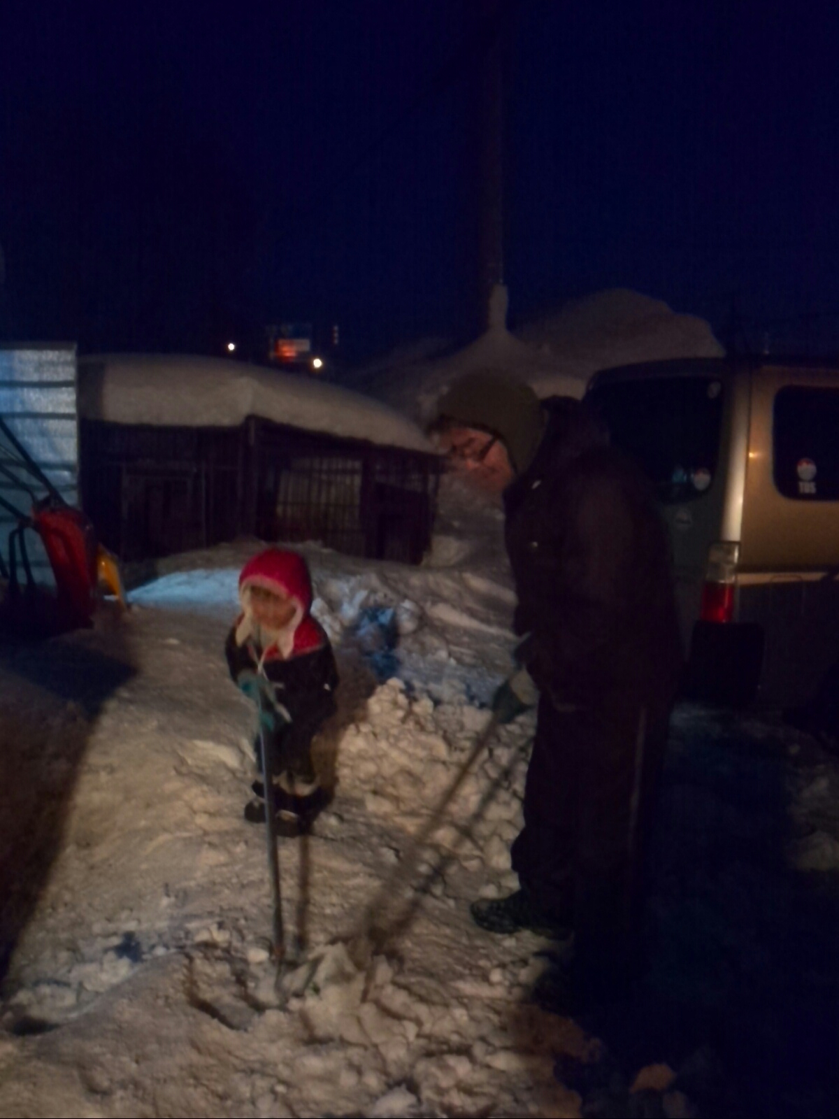 ツルハシで盛り上がった雪山を崩すのりりんを見て、くわで真似する息子。